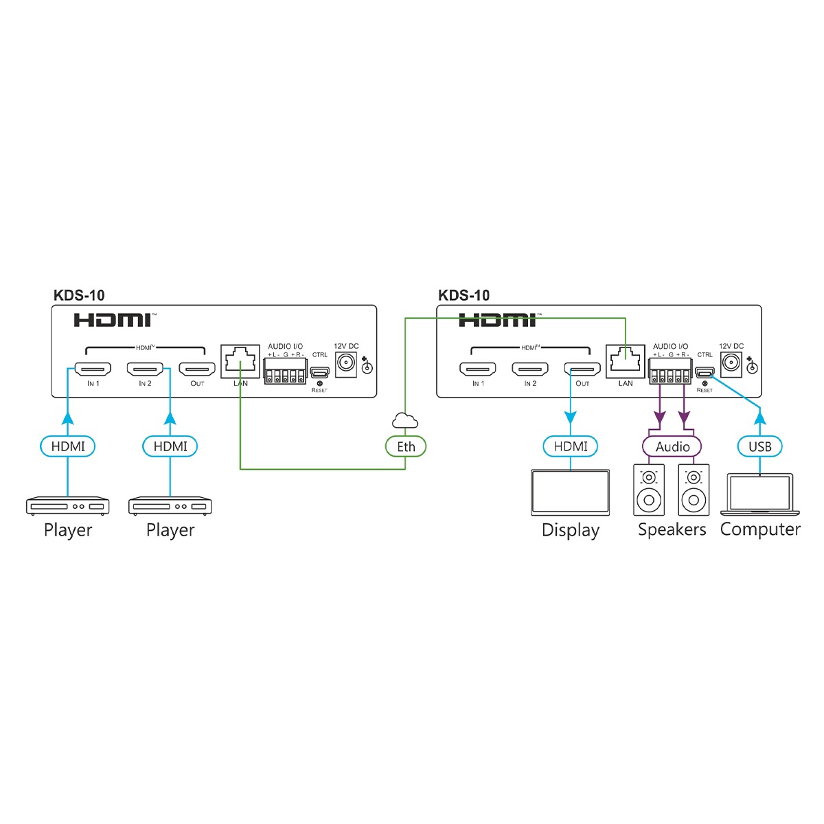 Centralized Management — Manage and configure multiple compatible KDS–8 devices through a single web interface. Control the independent routing of video, audio and control signals.