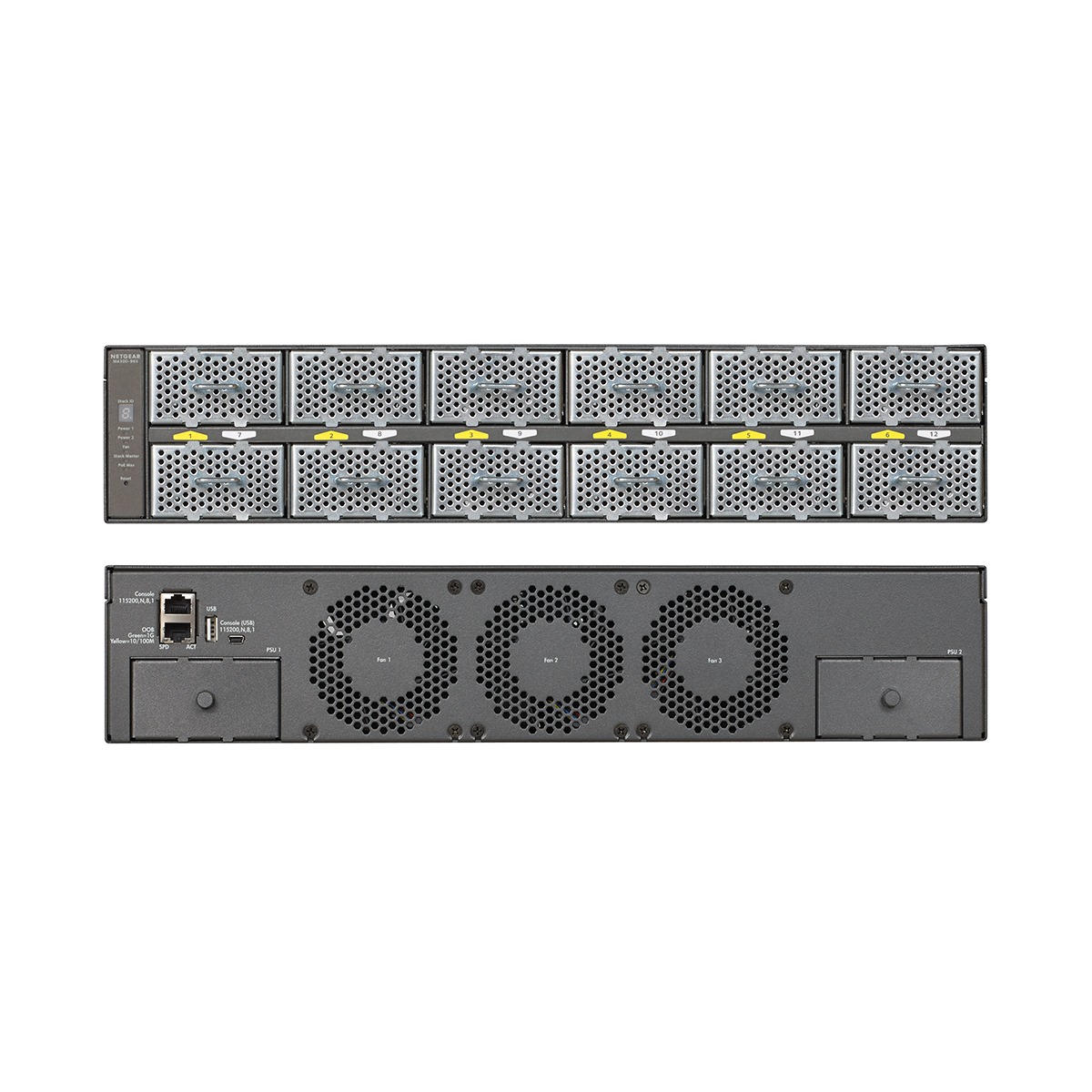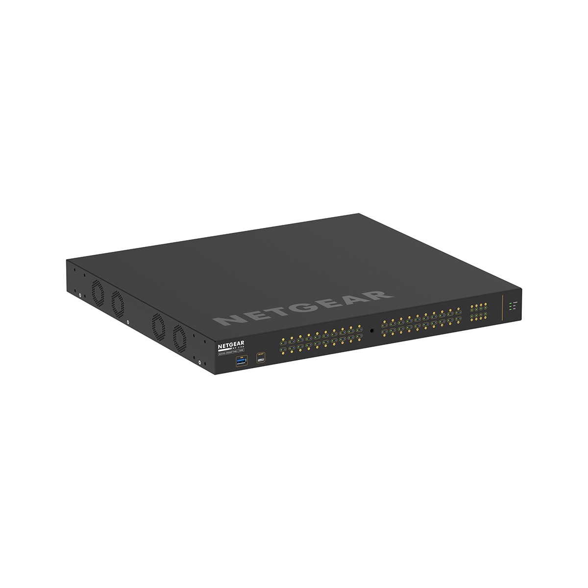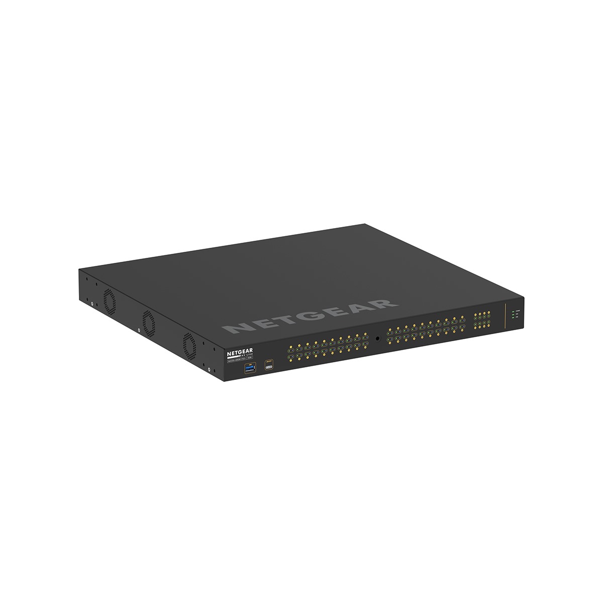 M4300−48X is a NETGEAR 48−port managed switch for 10G AV over IP deployments. It features 48 10GBASE−T (copper RJ−45) ports, 4 shared 10GBASE−X (fiber SFP+) ports, and includes a 250W power supply unit.