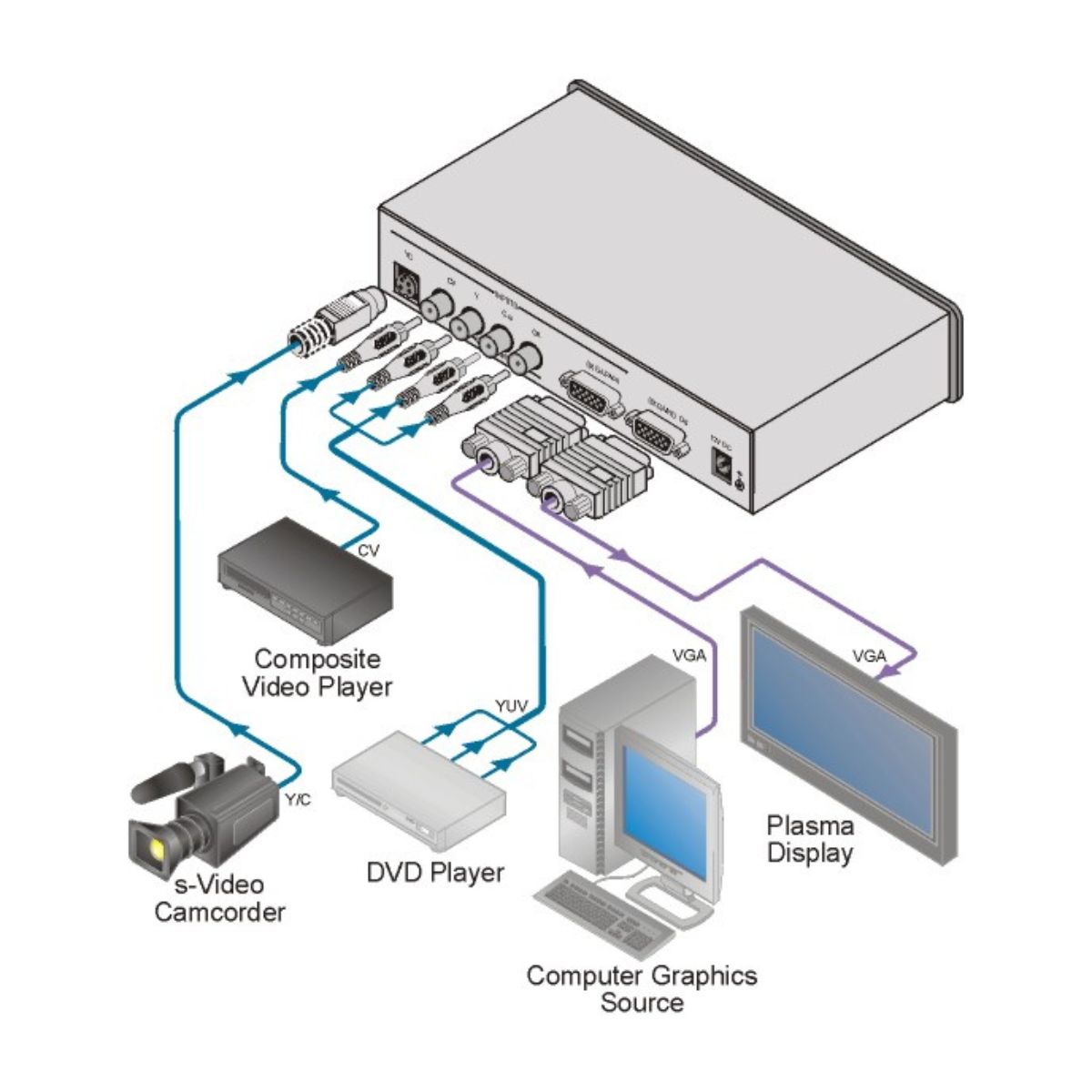 Multiple Formats — Supports composite and s–Video inputs and computer, HDTV and DVI outputs.