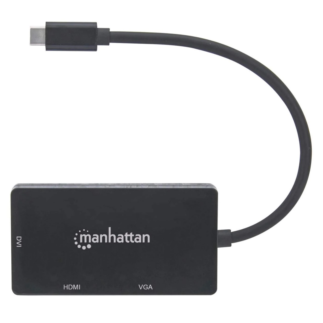 USB-C Male to DVI-I, HDMI or VGA Females; 4K@30Hz on HDMI Port, 1080p on VGA or DVI Ports; Black