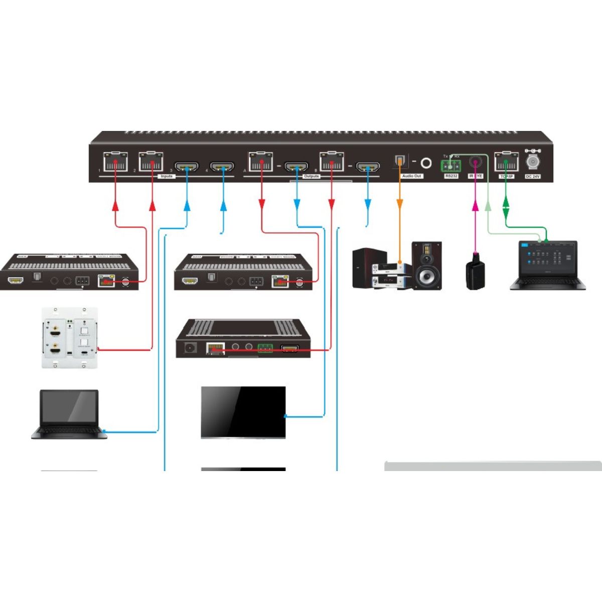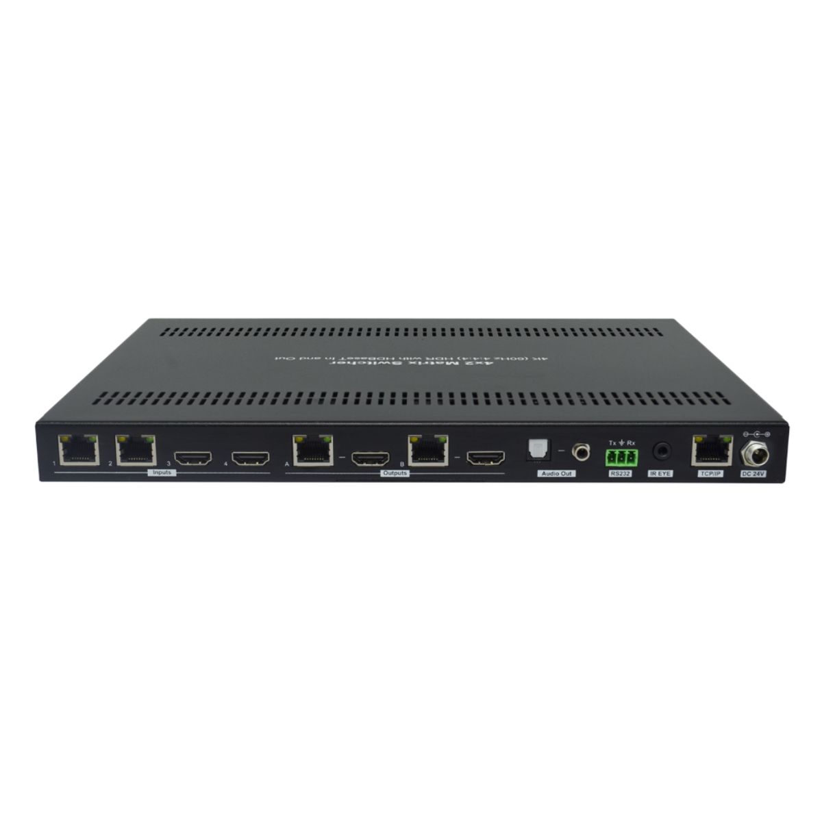 - 4x2 matrix switcher with HDBaseT inputs and outputs.
