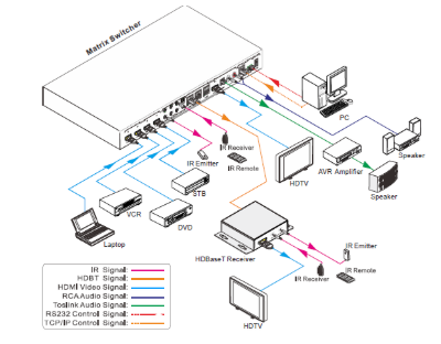 - HDBaseT Matrix Switcher that features 7 HDBaseT outputs and 1 HDMI output