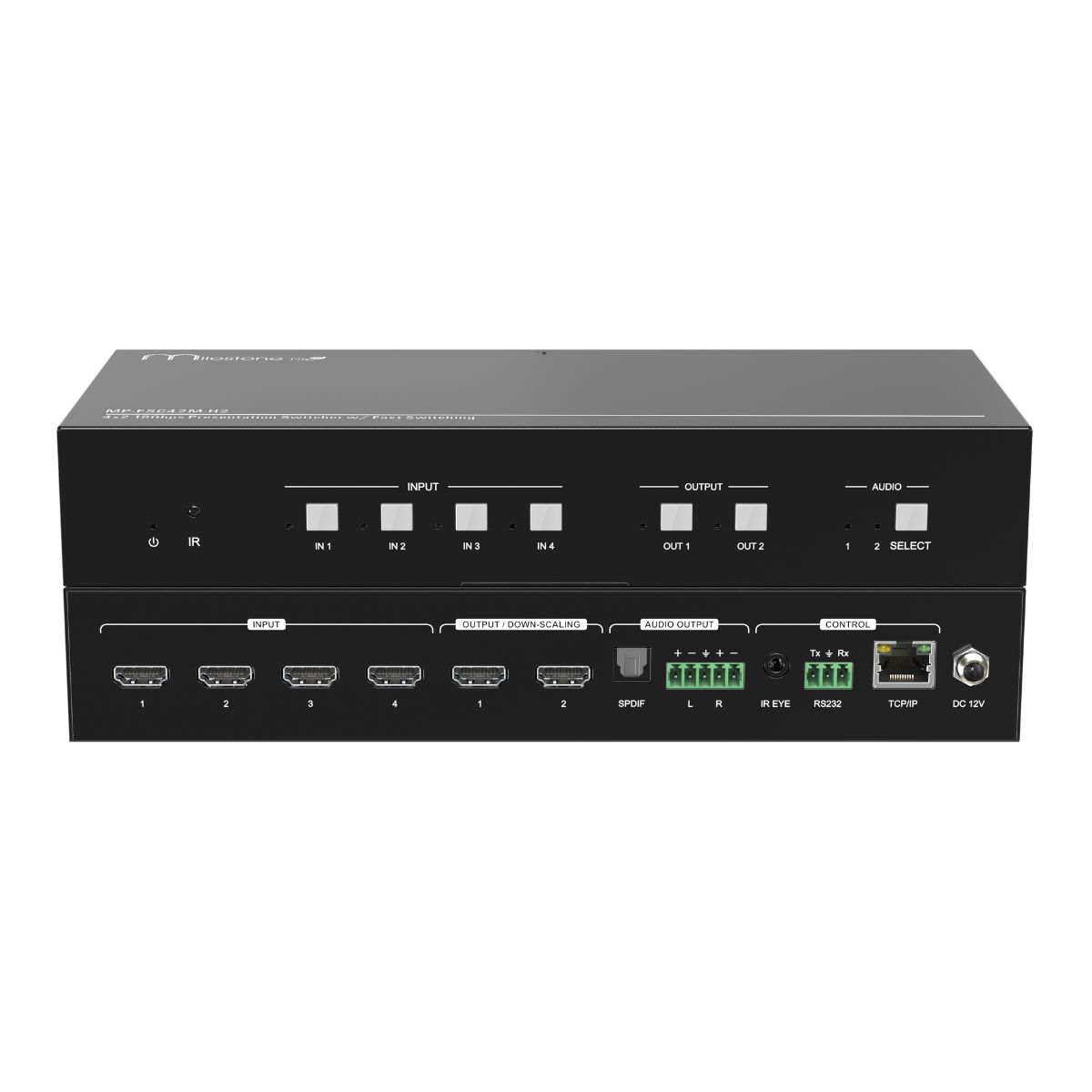 - 4x2 HDMI presentation switcher with matrix outputs.