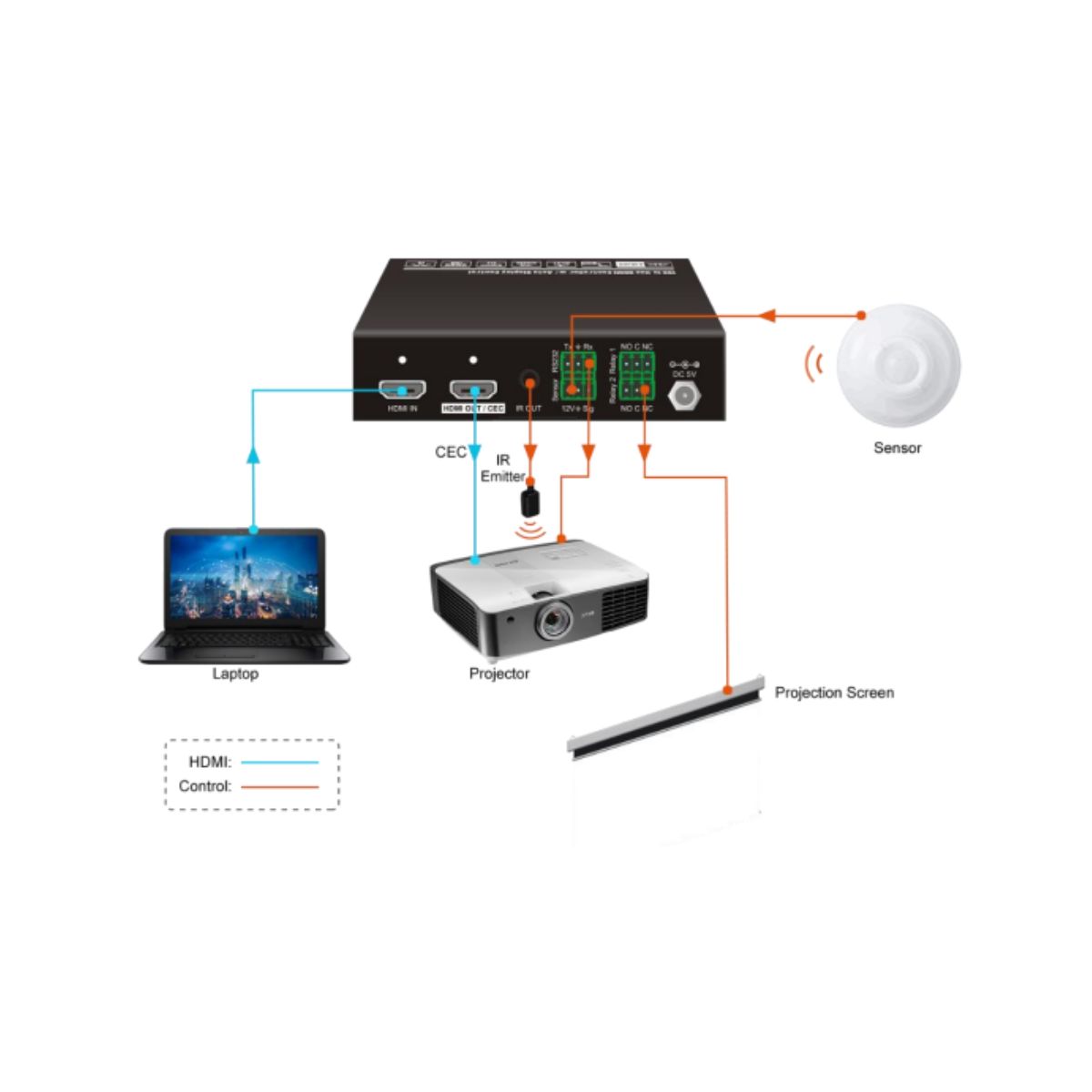 Allows the connected source and display to be controlled remotely via bi-directional IR pass-through.