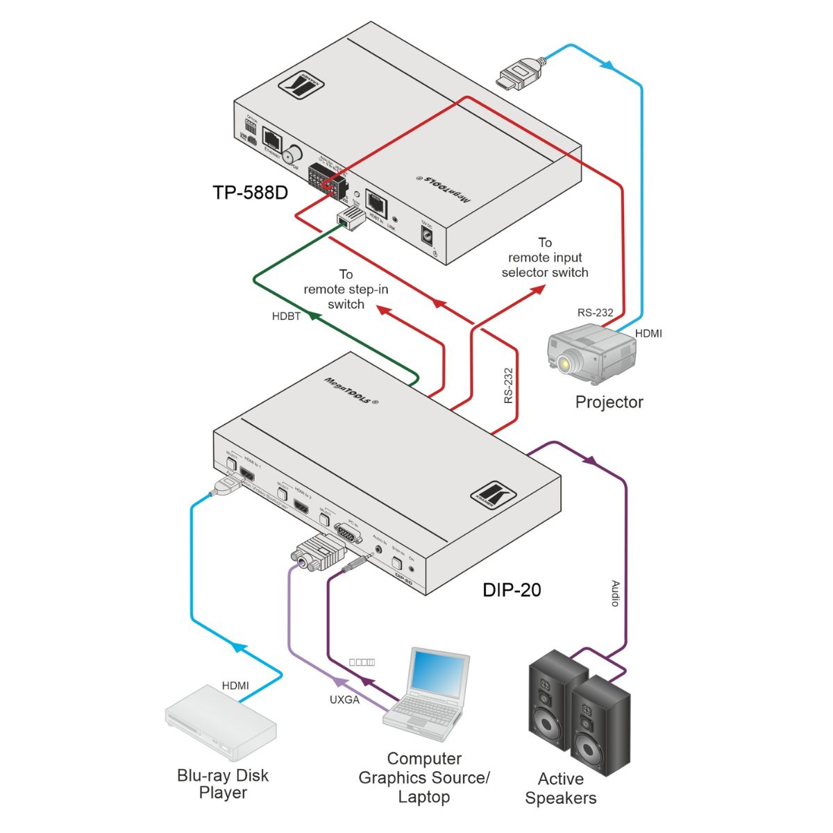 - HDBaseT Tunneling of Ethernet, RS–232 and IR signals, and PoE