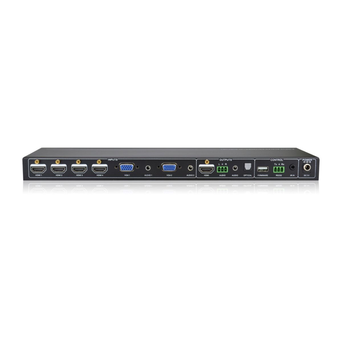 Control via Front panel buttons, RS232 commands, and IR Remote