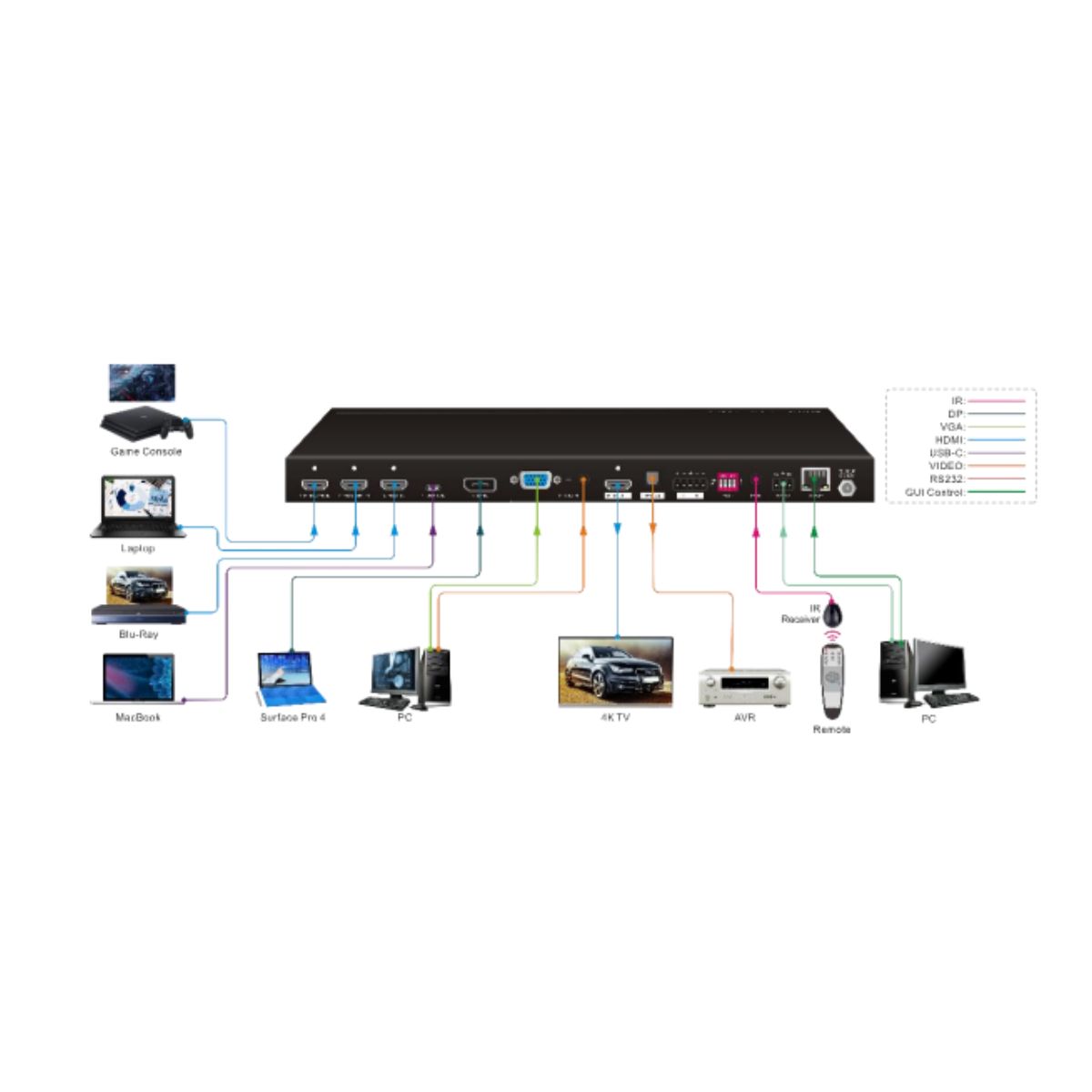 Controllable via buttons, IR Remote, RS232, and GUI.