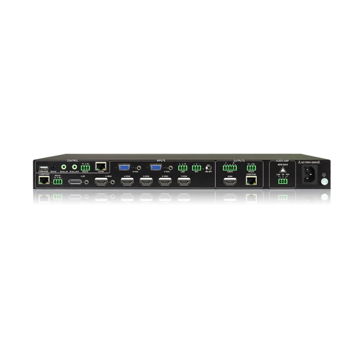 Control via Front panel buttons, RS232 commands, and IR Remote