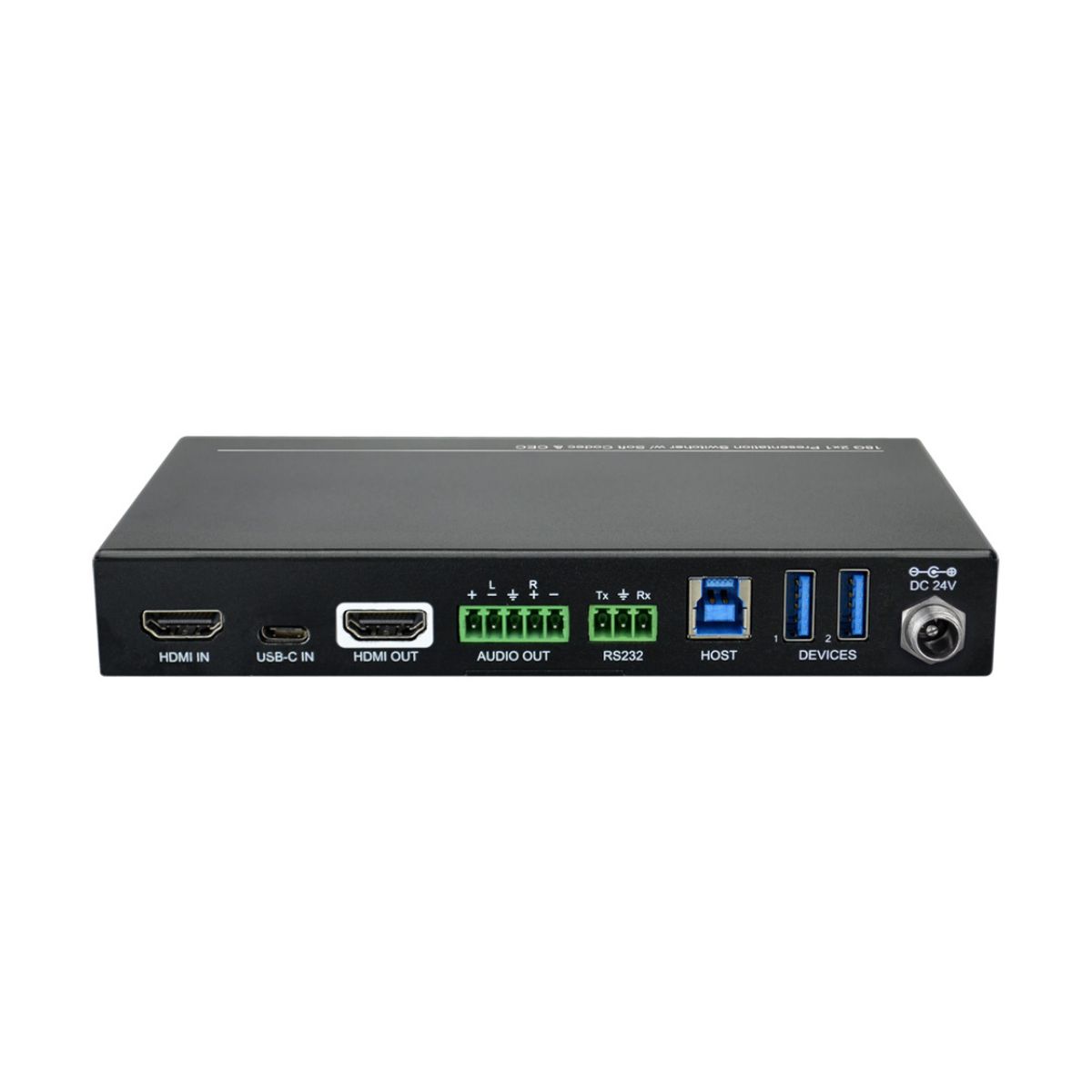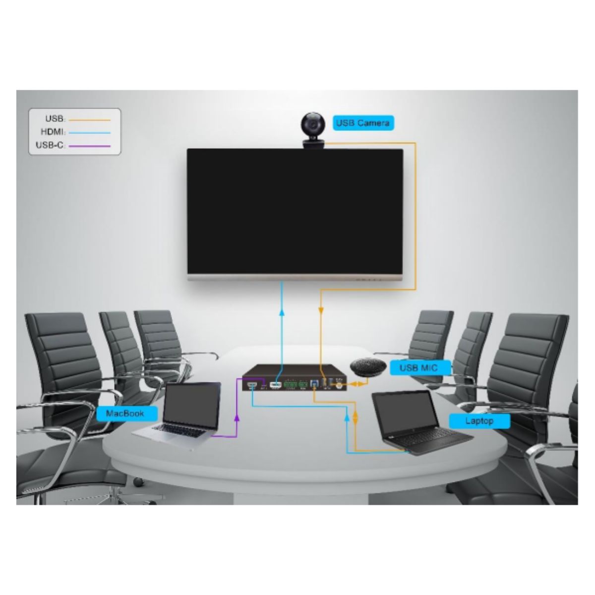 Peripheral units (e.g., microphone and camera) can be connected by type A USB (USB 3.0/2.0) ports and automatically switched along with HDMI and USB-C input as USB DEVICES for the corresponding HOST.