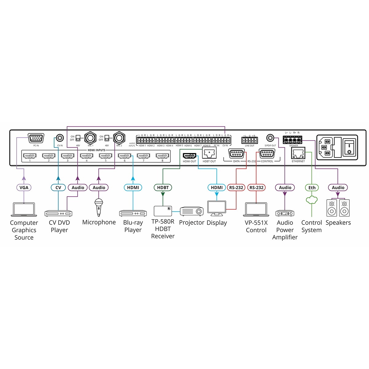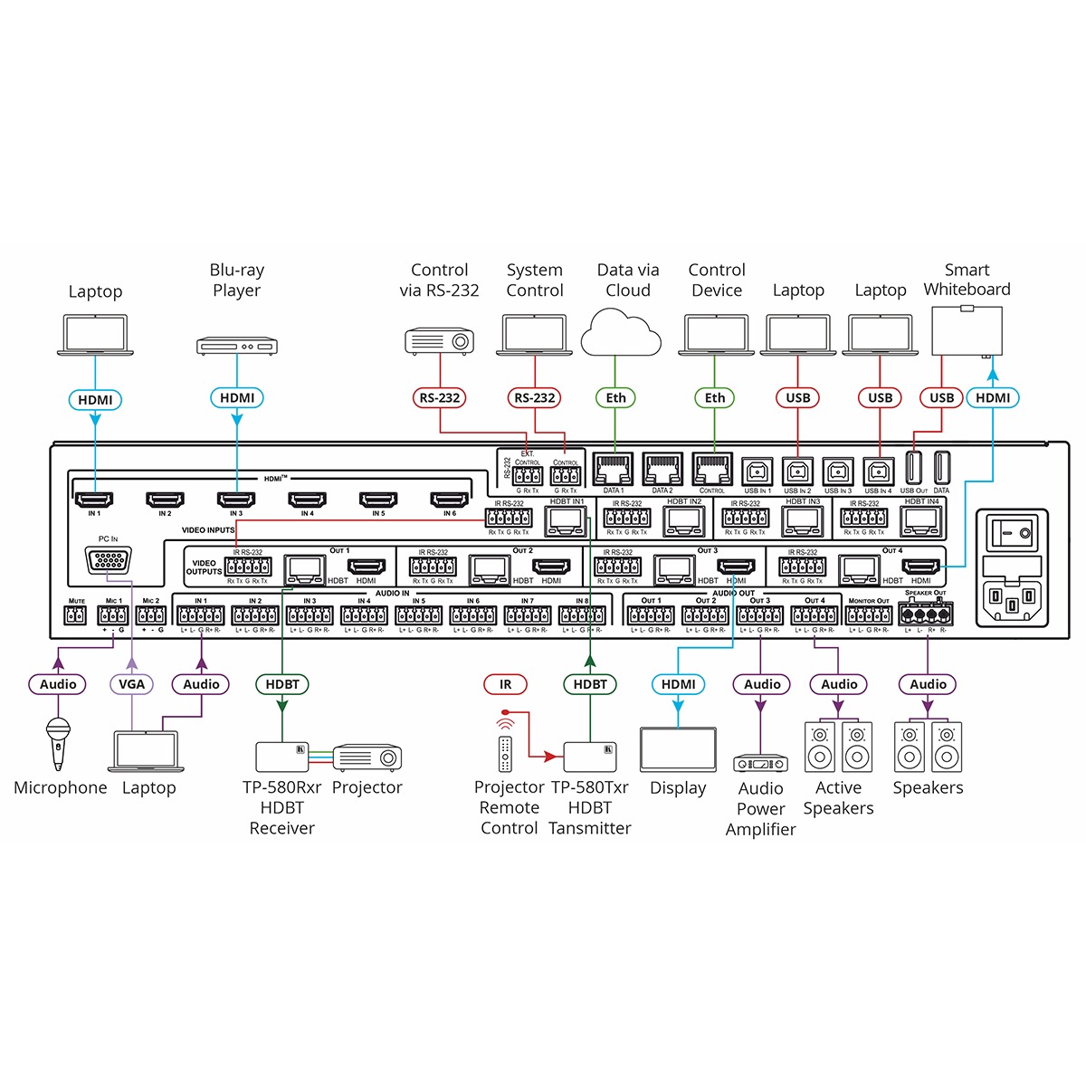 All–in–One Presentation System with 8x8 4K60 4:2:0 HDMI/HDBaseT 2.0 Matrix Switching, Master Room Controller, PoE & Power Amplifier
