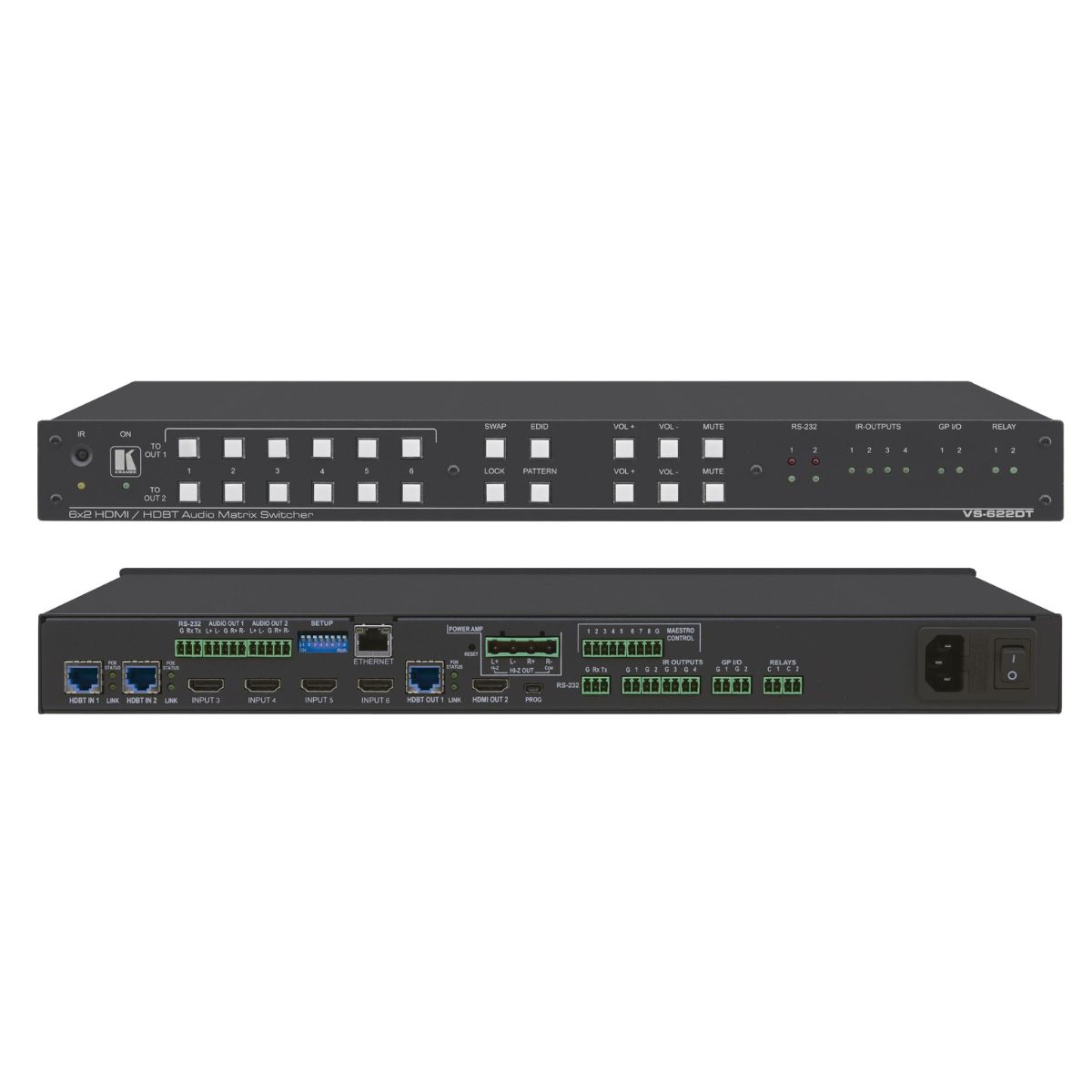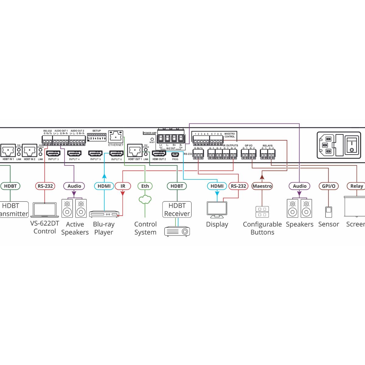 All–in–One Presentation System with 6x2 4K60 4:2:0 HDMI/HDBaseT Matrix Switching, Control Gateway, PoE, Power Amplifier & Maestro Room Automation
