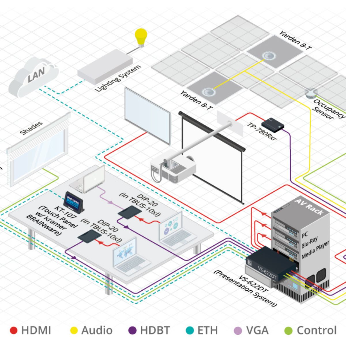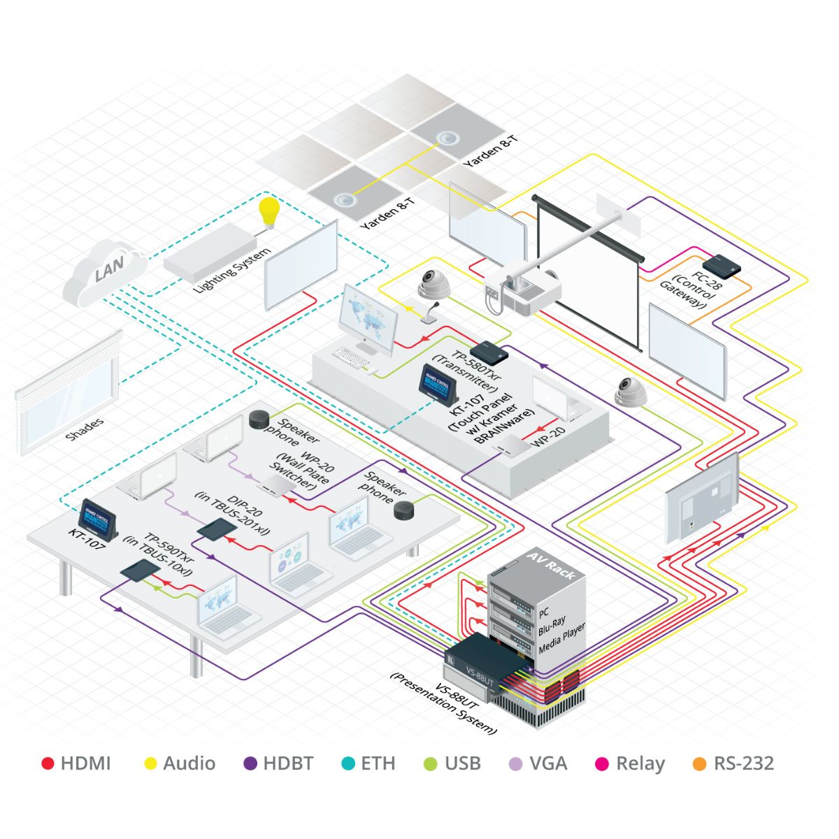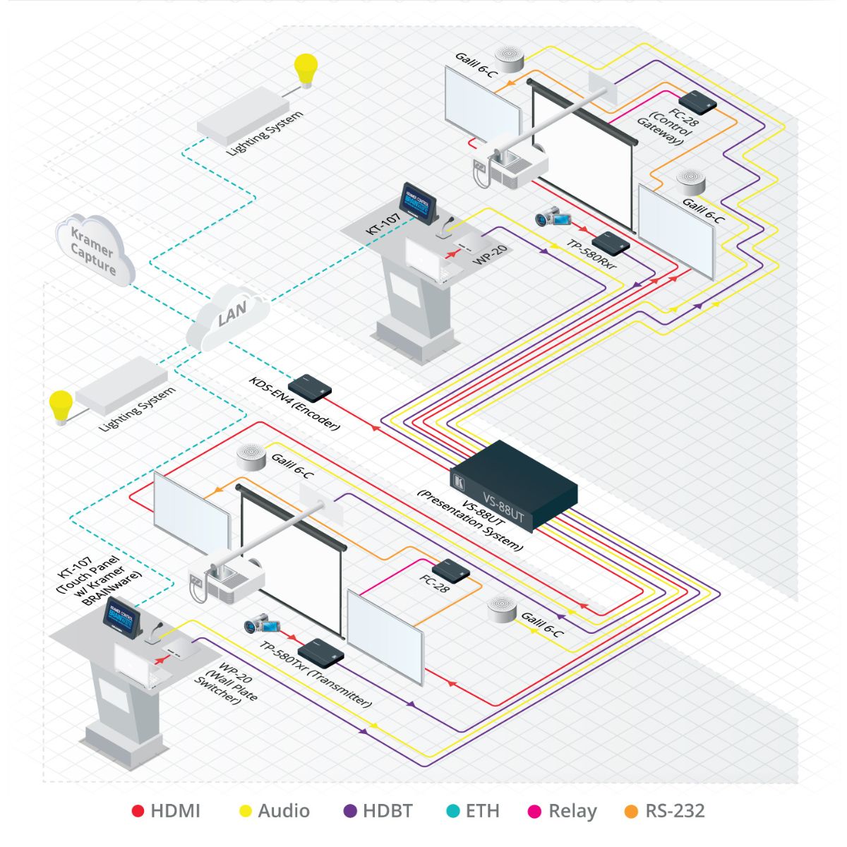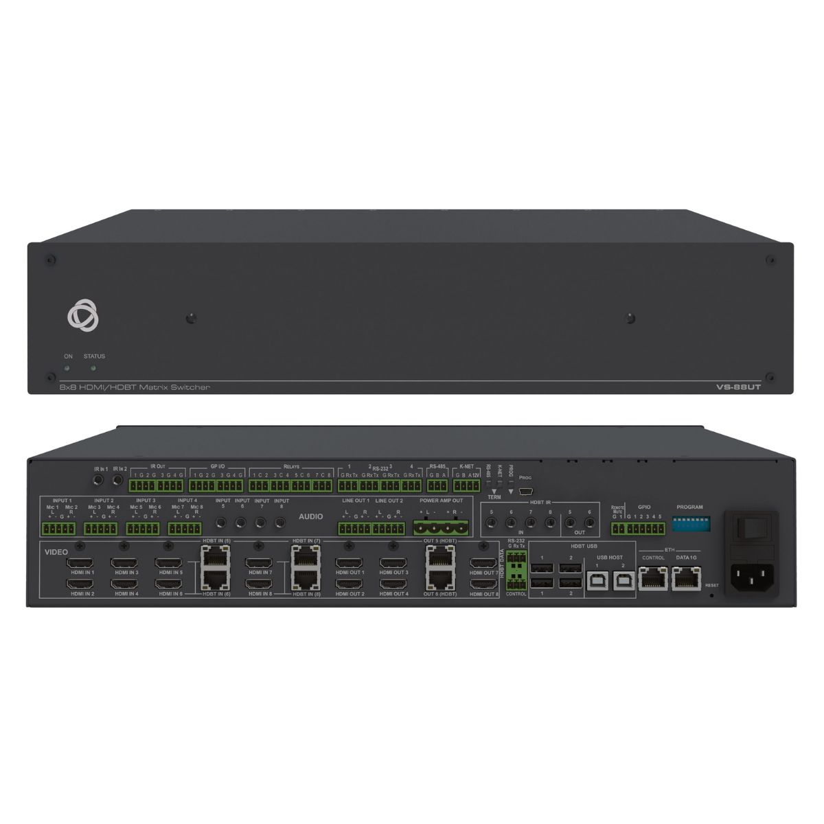 All–in–One Presentation System with 8x8 4K60 4:2:0 HDMI/HDBaseT 2.0 Matrix Switching, Master Room Controller, PoE & Power Amplifier