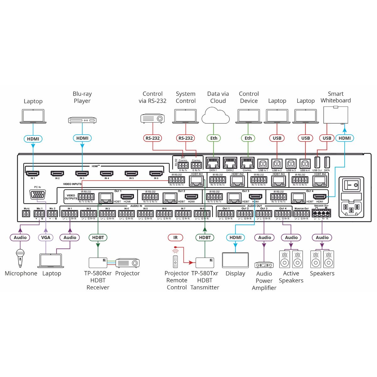 All–in–One Presentation System with 6x2 4K60 4:2:0 HDMI/HDBaseT Matrix Switching, Control Gateway, PoE, Power Amplifier & Maestro Room Automation