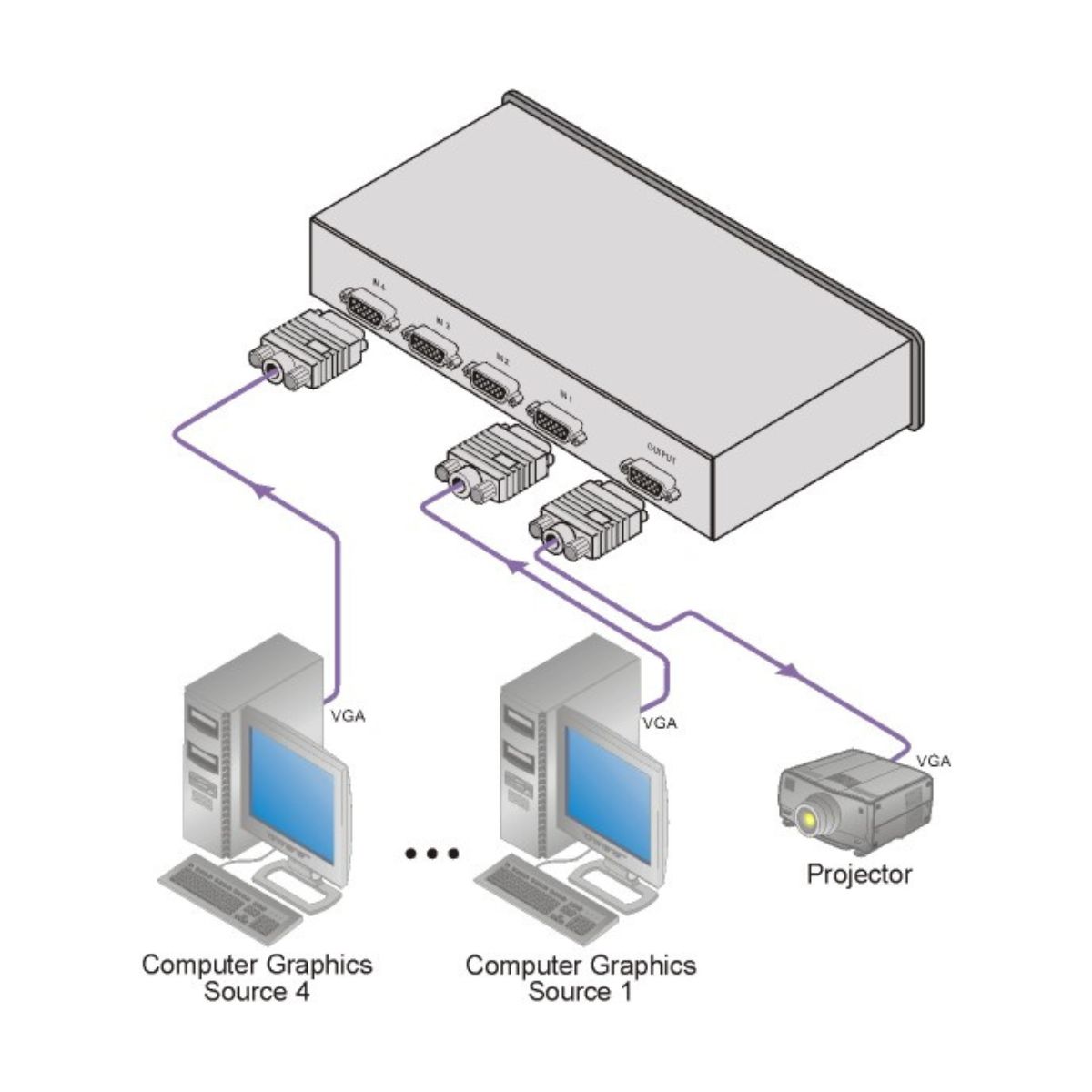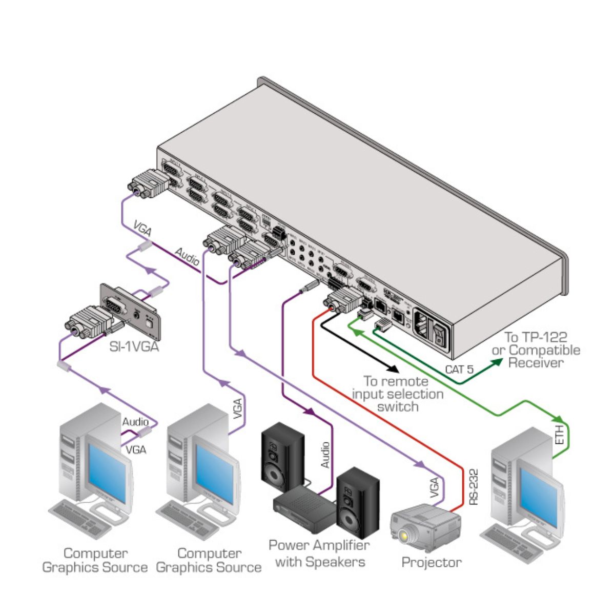 Remote Step–In Switching — Up to 8 users, connected through SI–1VGA remote input/switching step–in modules, can each step in to switch the input to the local remote PC.