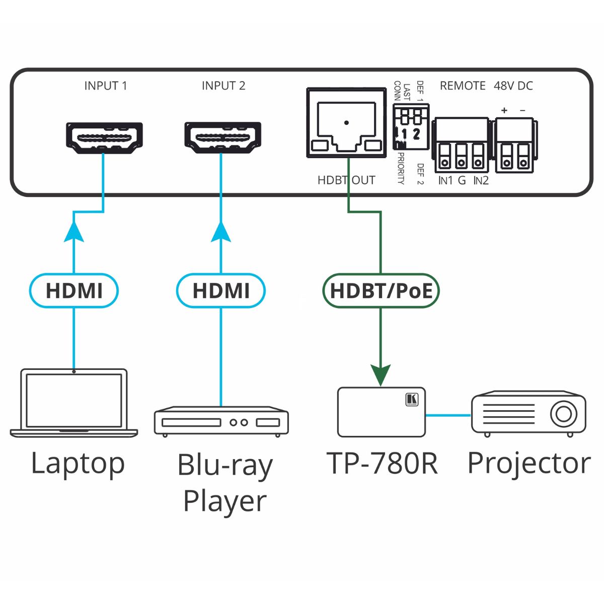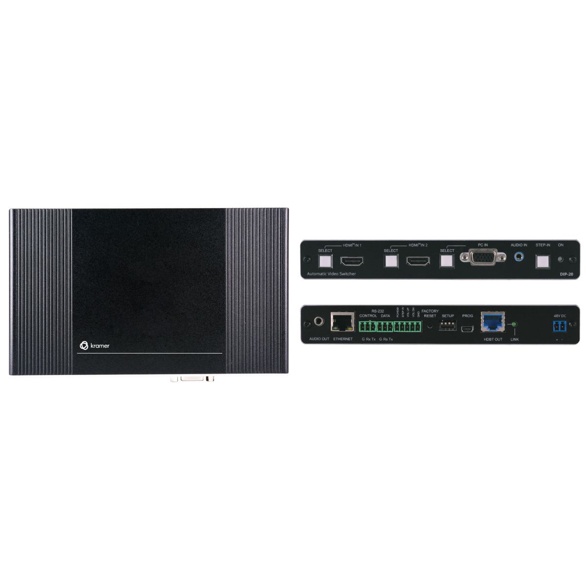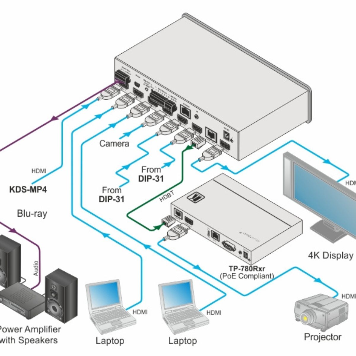 - HDBaseT Tunneling of Ethernet, RS–232 and IR signals, and PoE