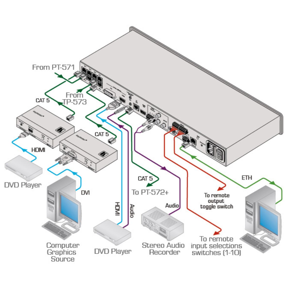 - Cascades Up to Four Units — Via the HDMI port to provide up to 8 twisted pair inputs.