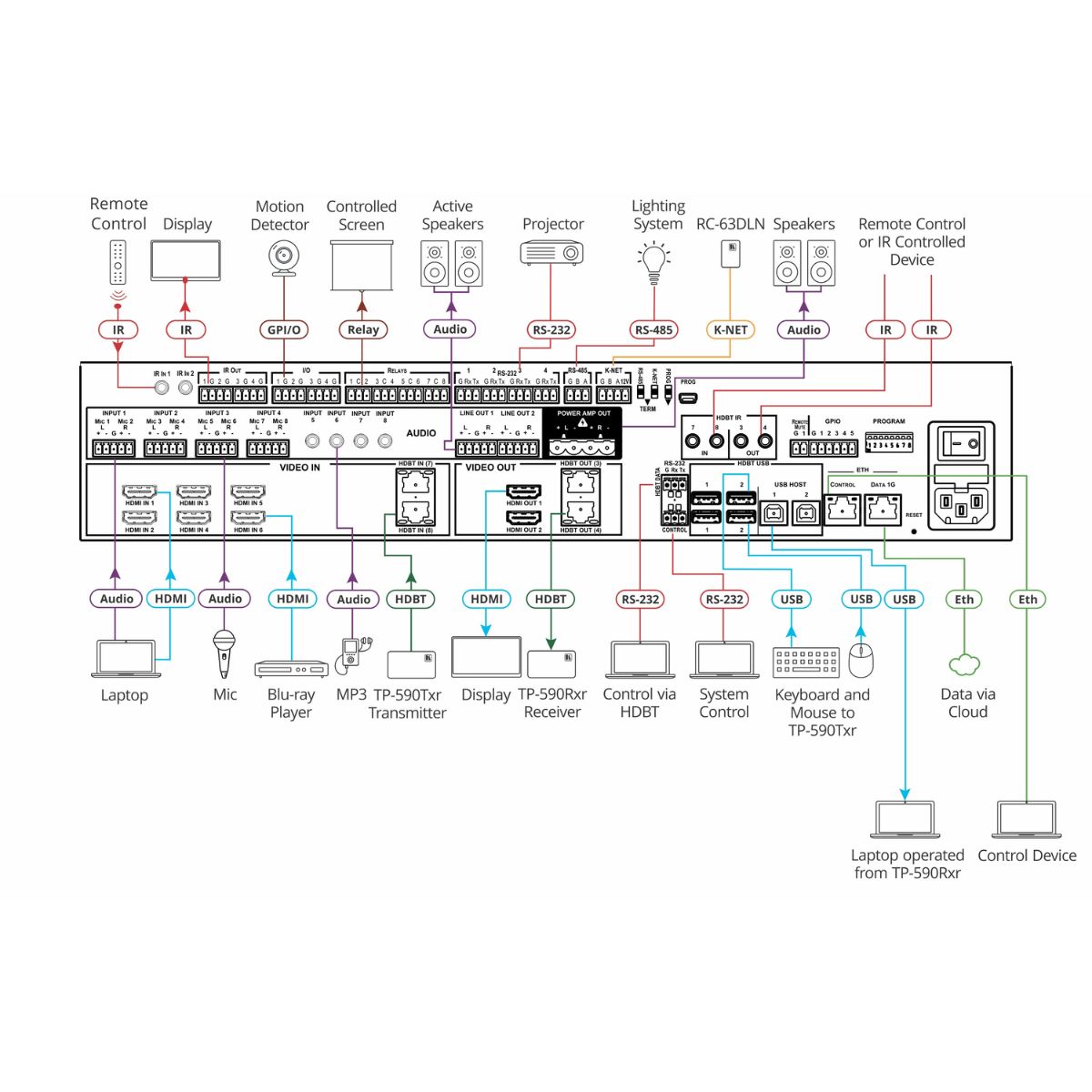 - RS–232, RS–485, IR, GPI/O, and relay ports