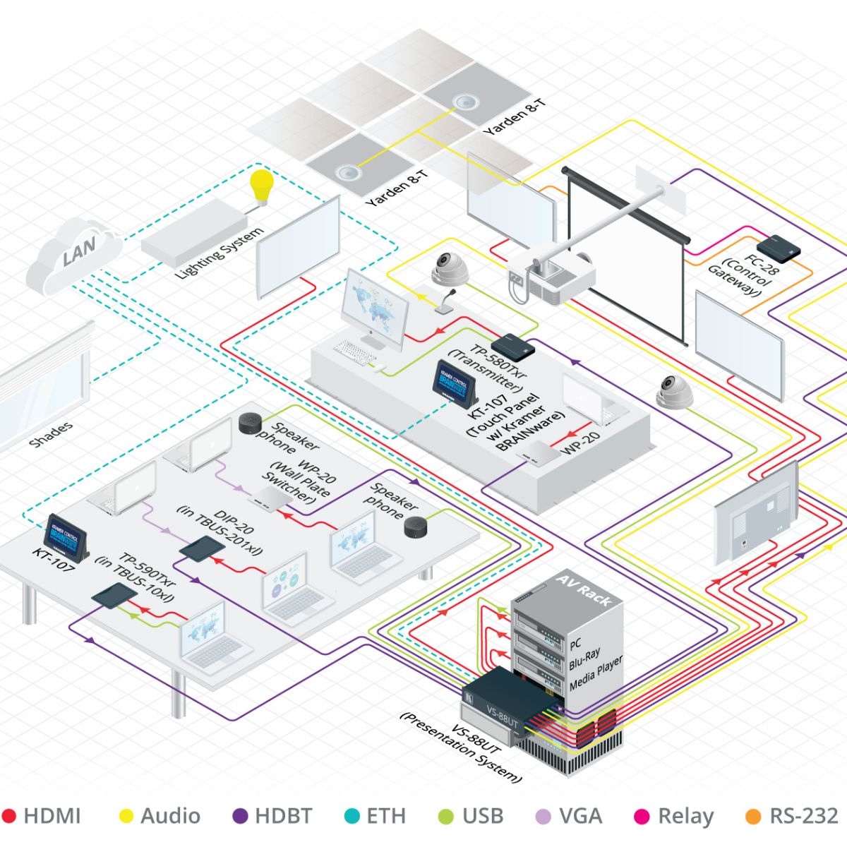 All–in–One Presentation System with 8x8 4K60 4:2:0 HDMI/HDBaseT 2.0 Matrix Switching, Master Room Controller, PoE & Power Amplifier