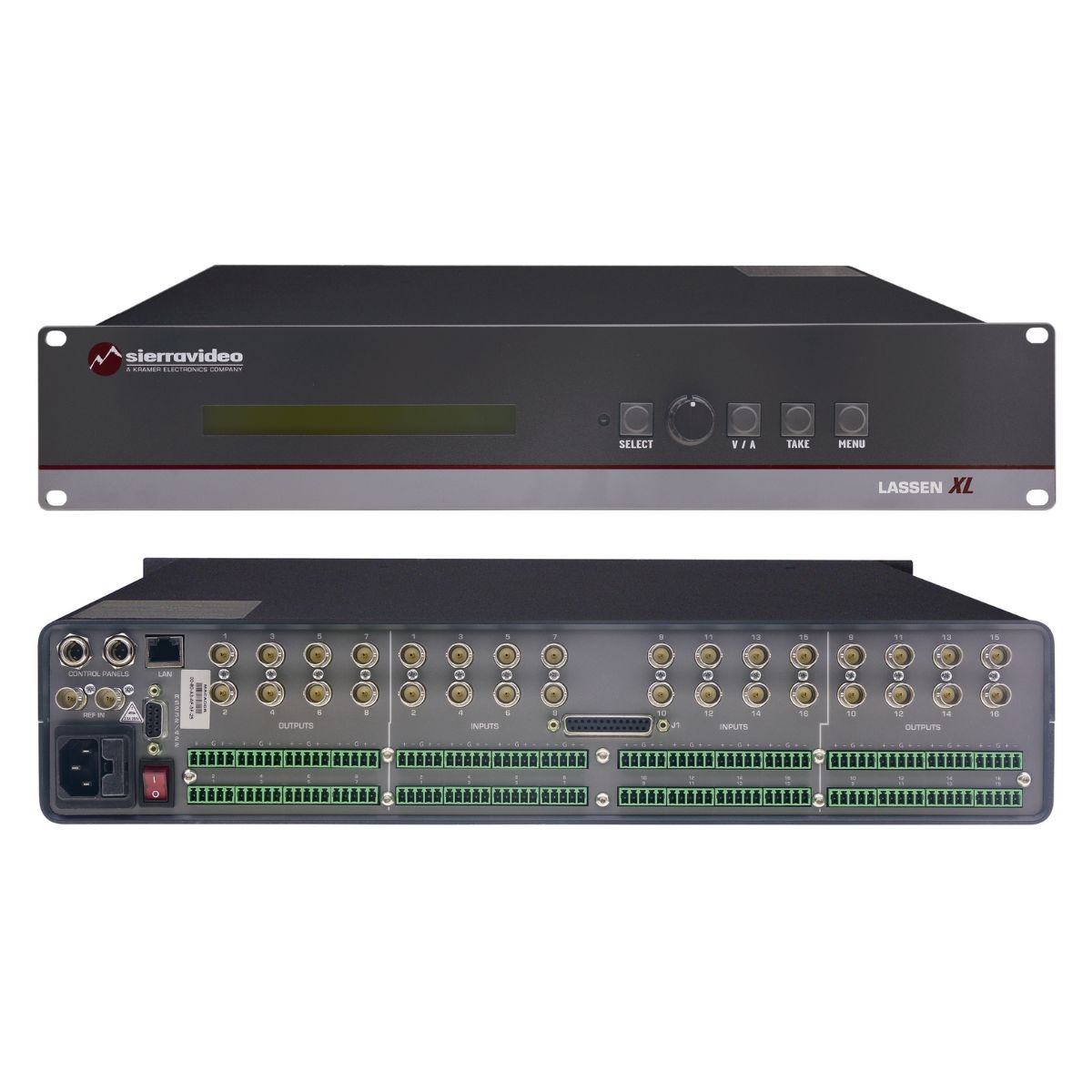 The Lassen HD XL Series offers flexibility and adaptability to any application where saving space and costs are important. 1616HDS−XL is a 16x16 HD−SDI (1.5G) & Analog Balanced Stereo Audio matrix switcher, available in a compact 2RU frame. 1616HDS−XL also supports breakaway stereo audio switching whereby the Digital Video, Audio Left, and Audio Right can all be routed independently. It offers control via the front panel or remotely via RS−232 or Ethernet.