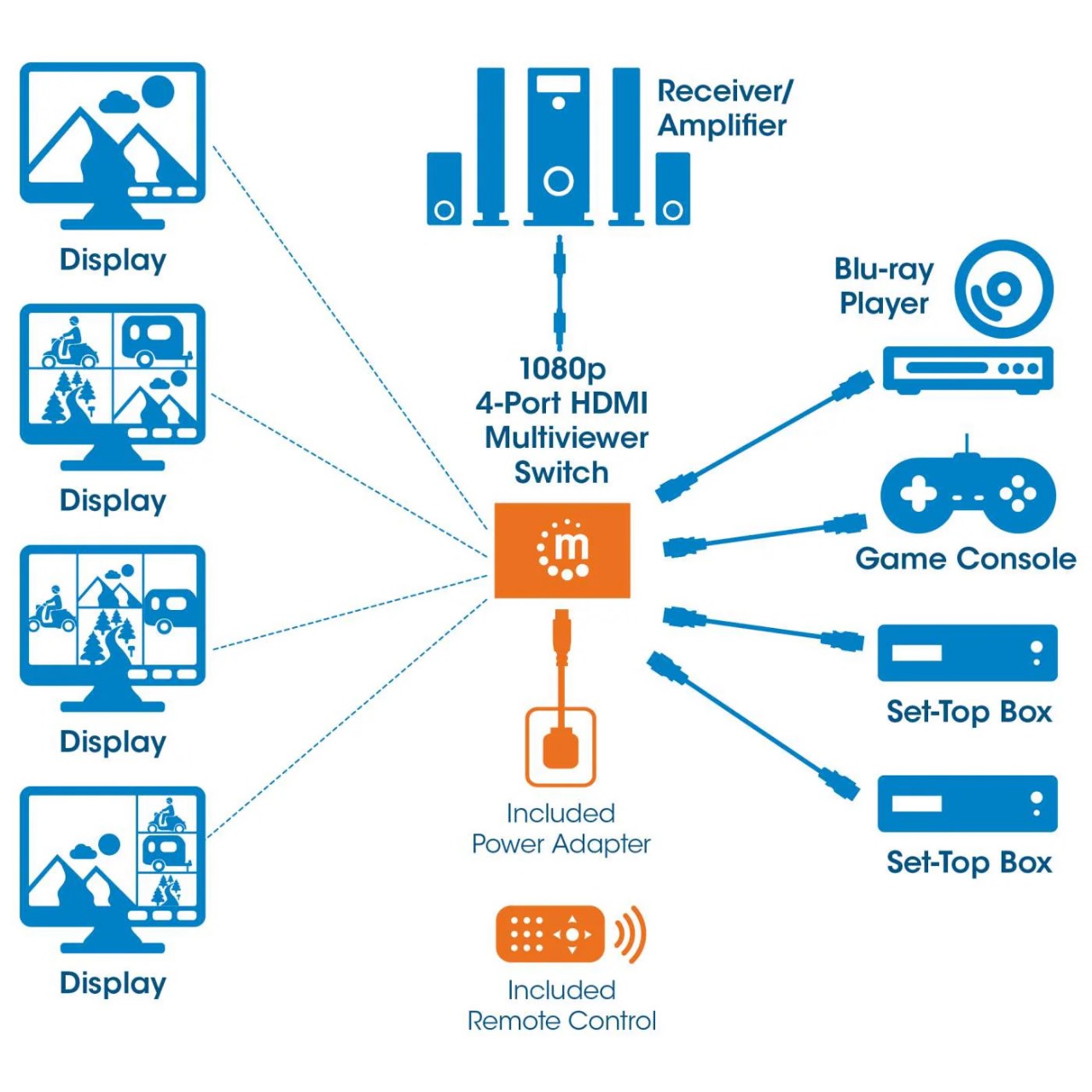 - Share up to four HDMI Audio/Video sources on one display at the same time, or one at a time