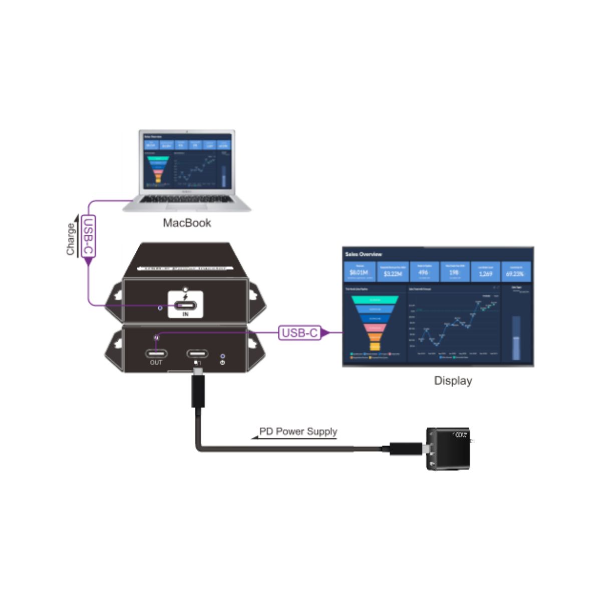 - Powered from USB-C port, no external power supply required.