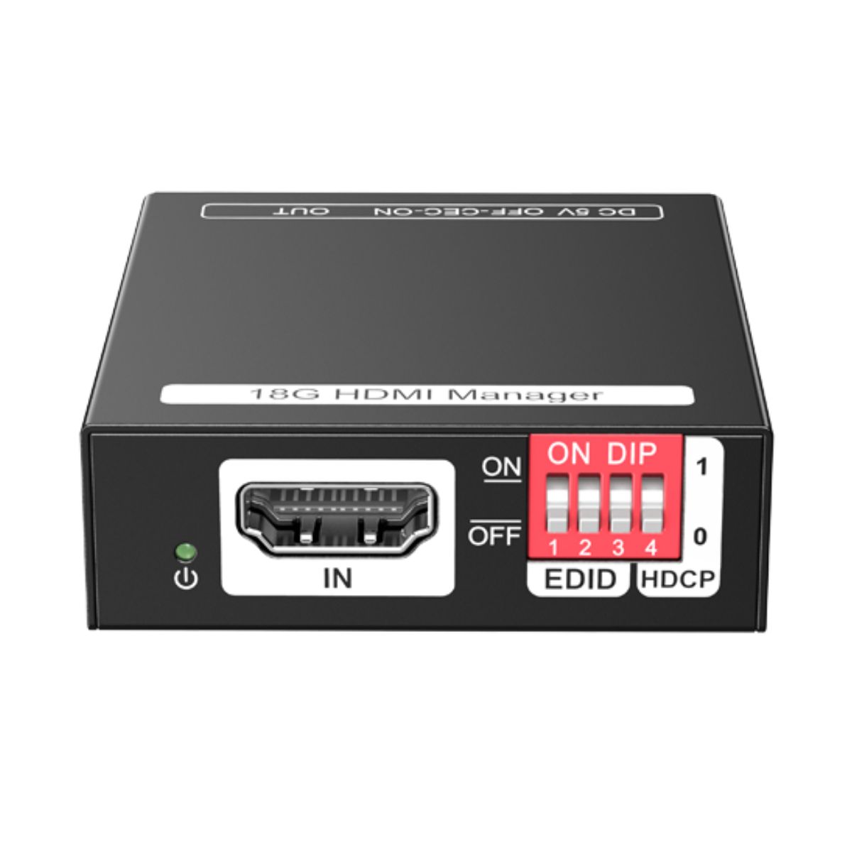 - Provides a 4-pin DIP switch for setting video resolution and HDCP content.