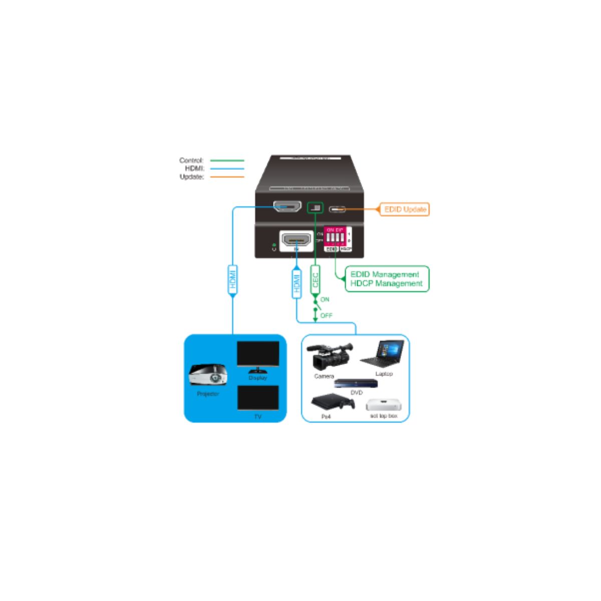 - Supports HDMI2.0 4K@60Hz/4:4:4 HDR, EDID & CEC pass through.