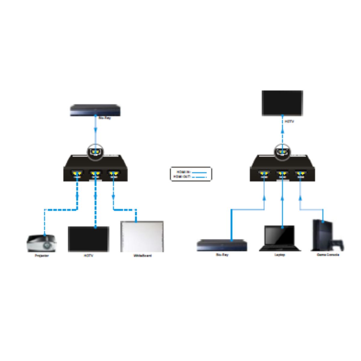 - 3 HDBaseT outputs, distances up to 70m at 1080p and 40m at 4Kx2K on a single CAT5e/6 cable can be achieved.