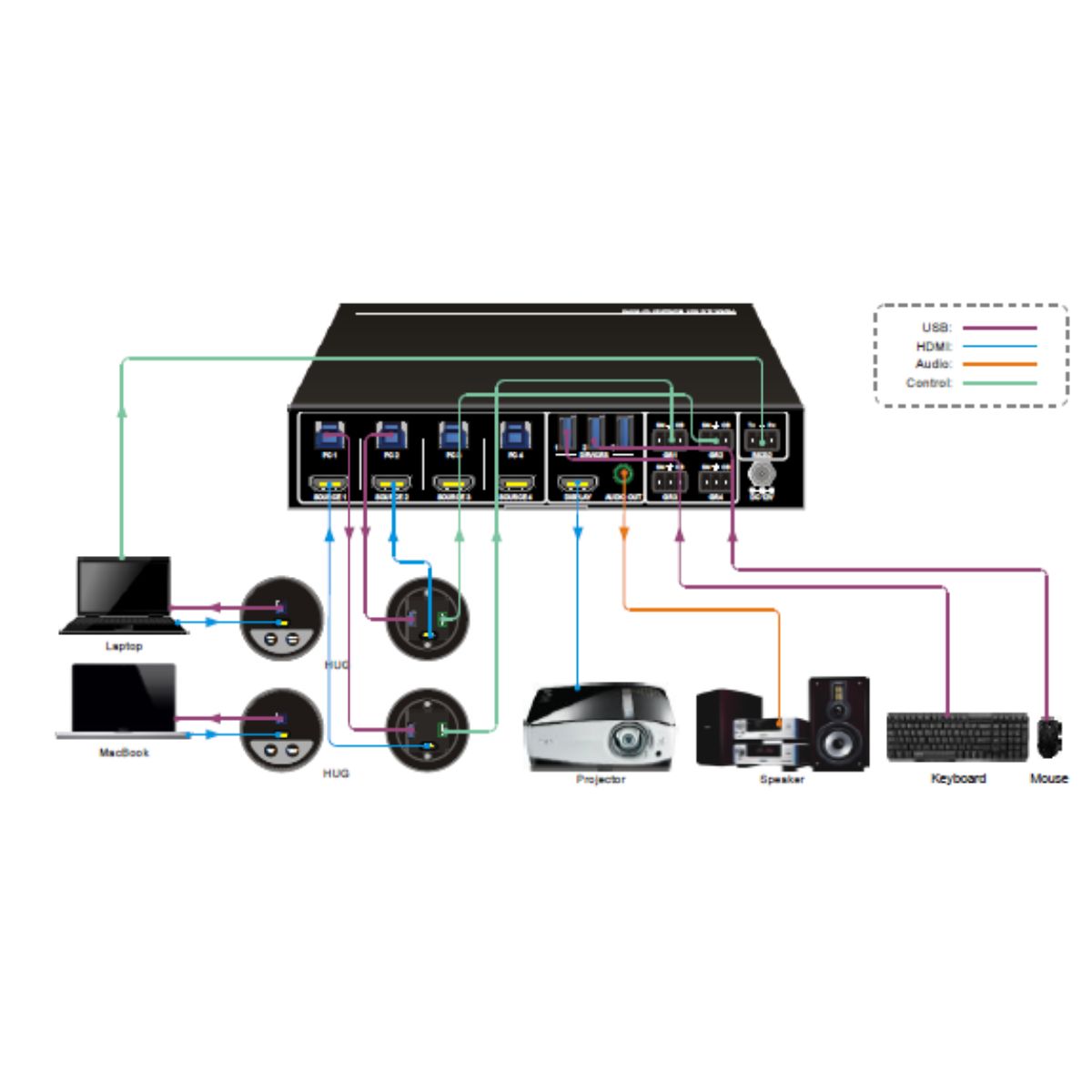 - Controls four HDMI computers via one keyboard, one mouse, and one monitor.
