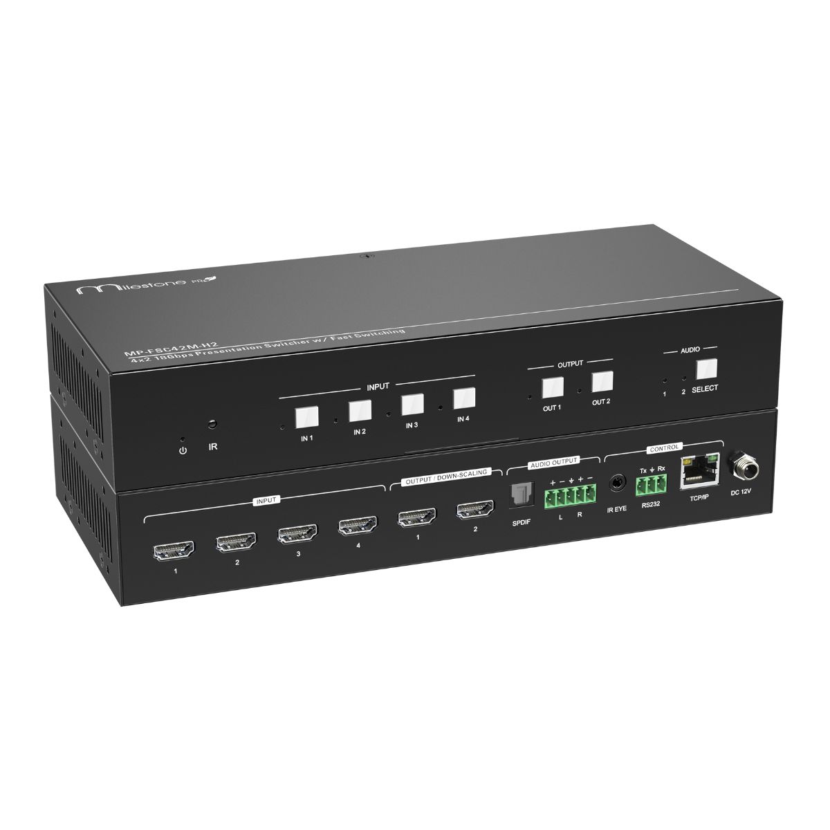 - 4x2 HDMI presentation switcher with matrix outputs.