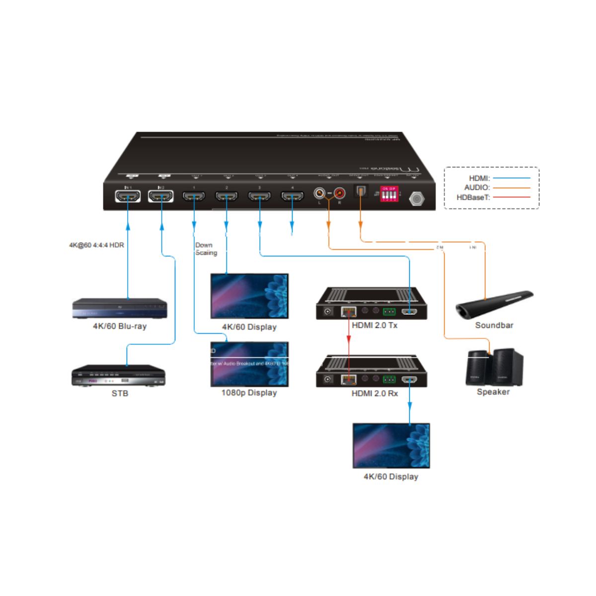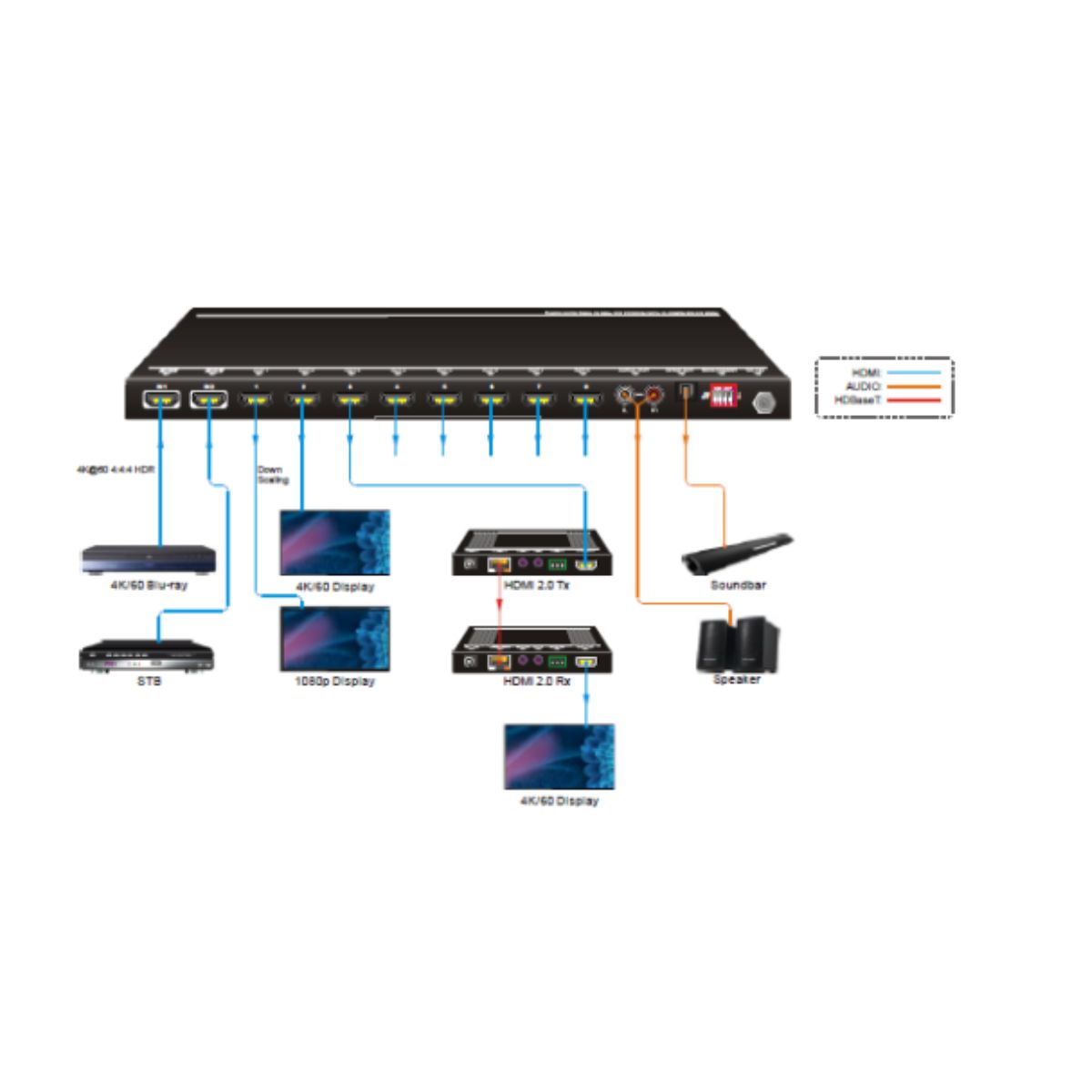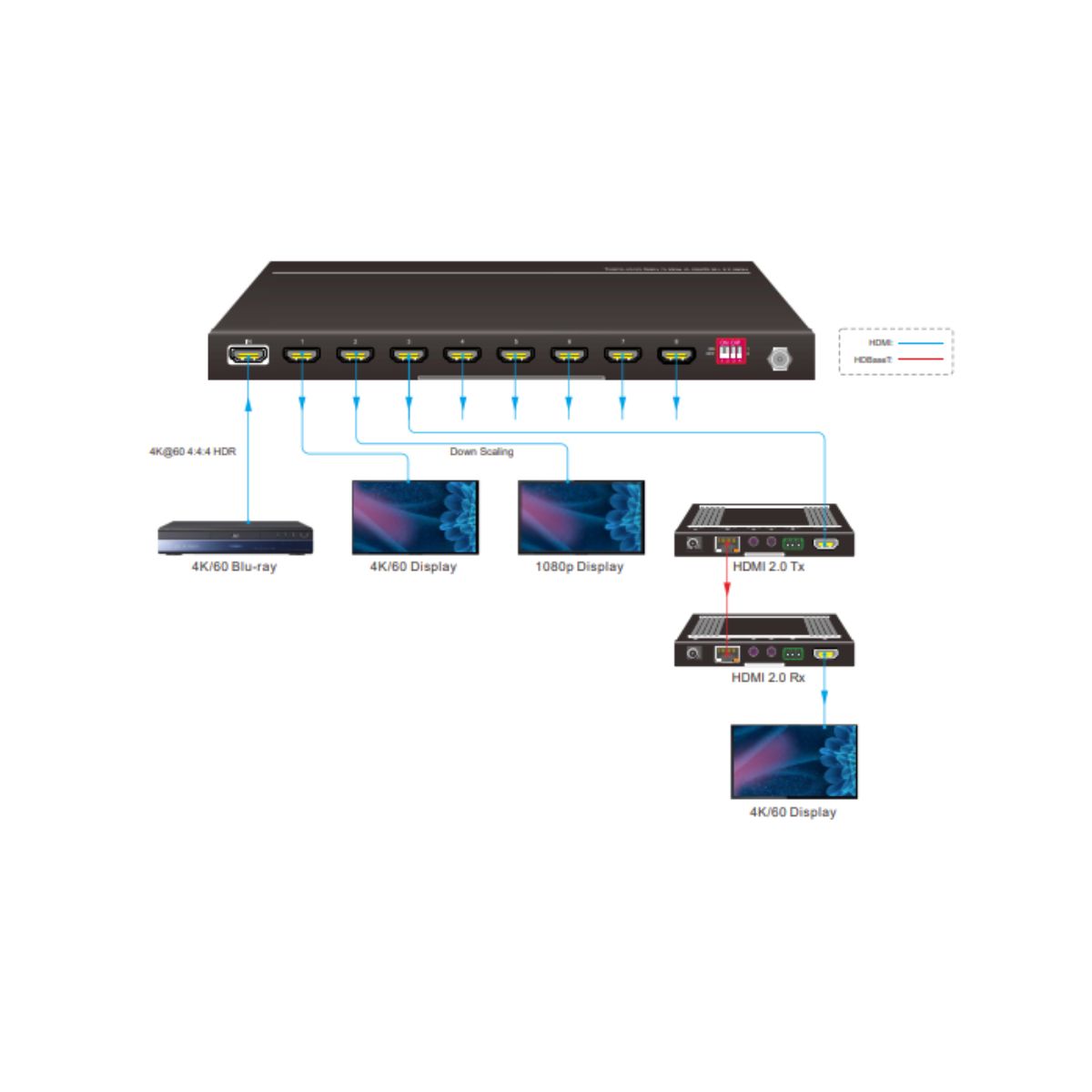 Supports video resolution down-scaling; the 4K input can be automatically degraded to 1080p output on the receiver for compatibility with legacy 1080p display devices.