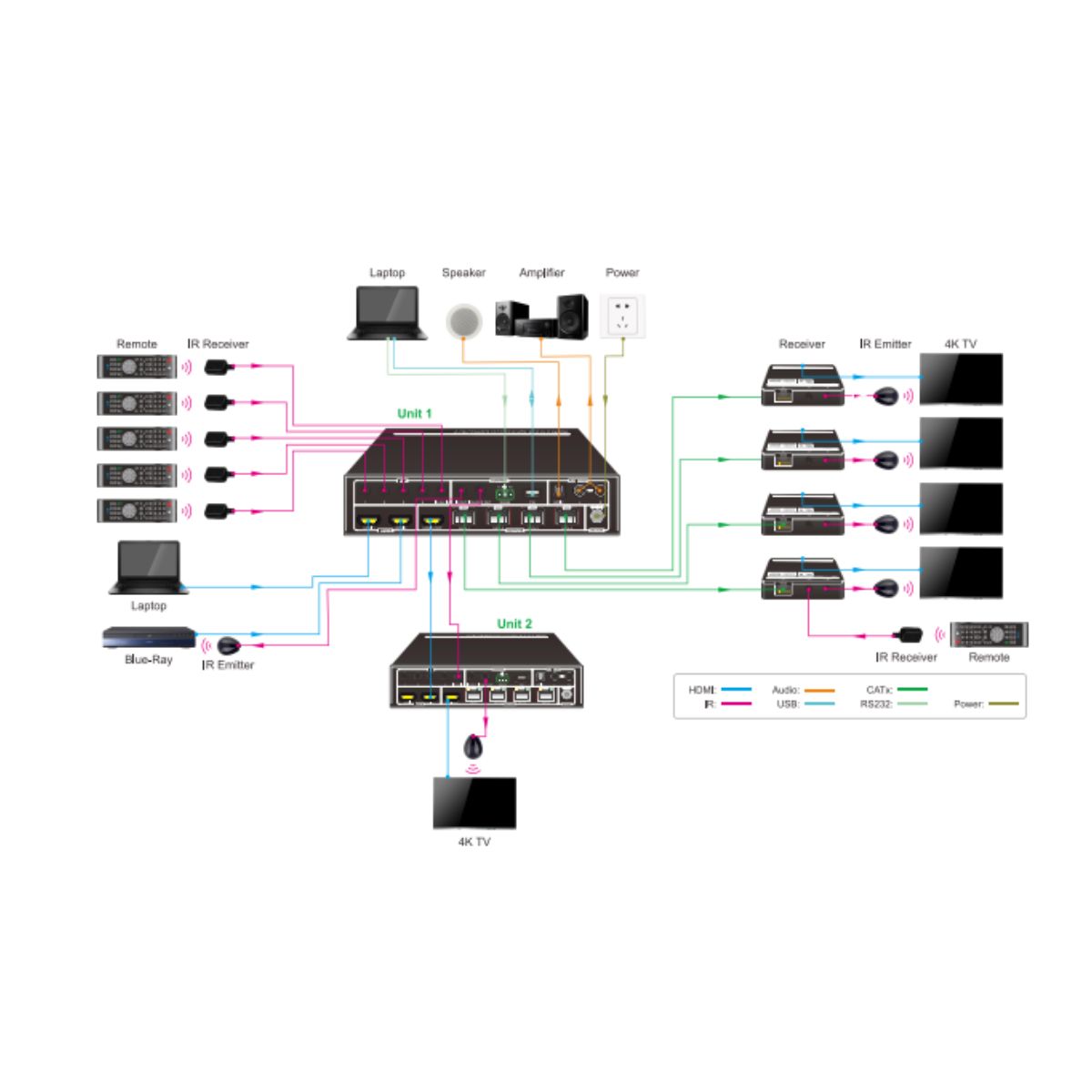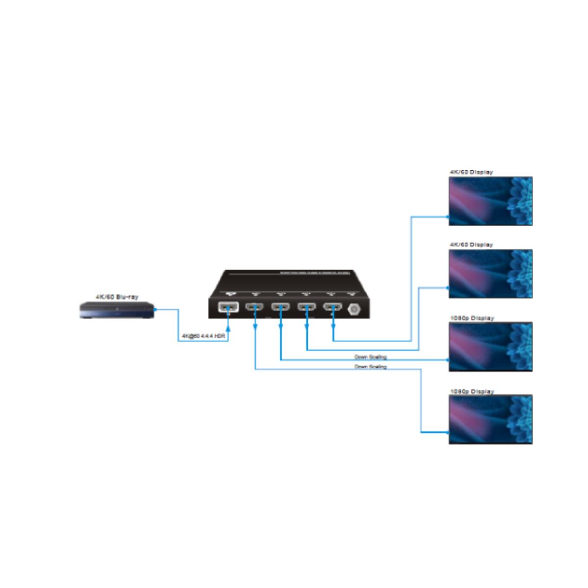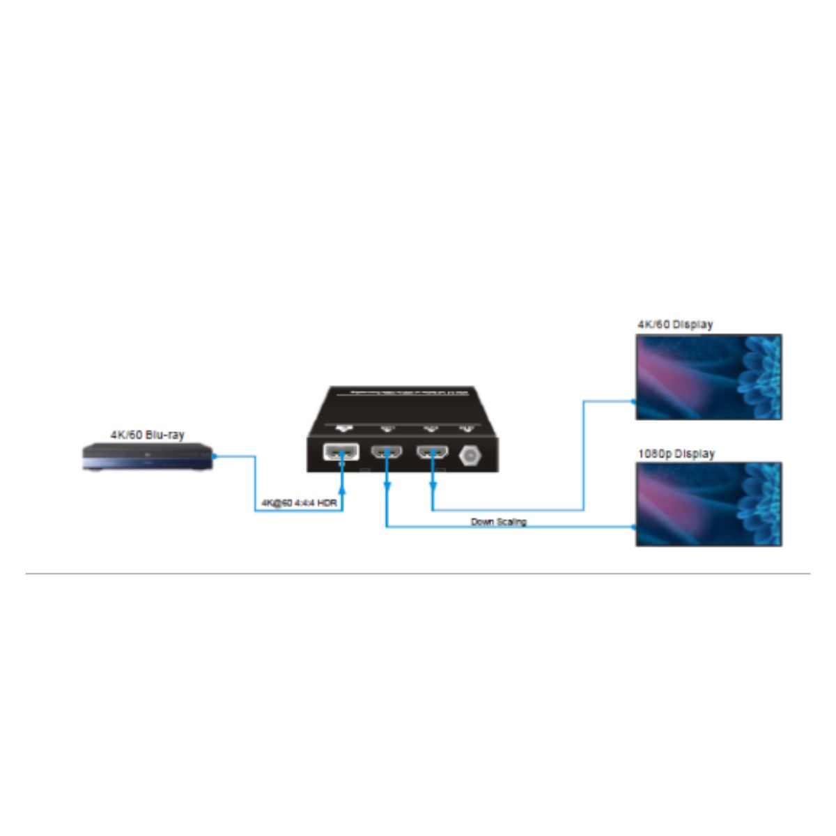 Supports video resolution down-scaling; the 4K input can be automatically degraded to 1080p output on the receiver for compatibility with legacy 1080p display devices.