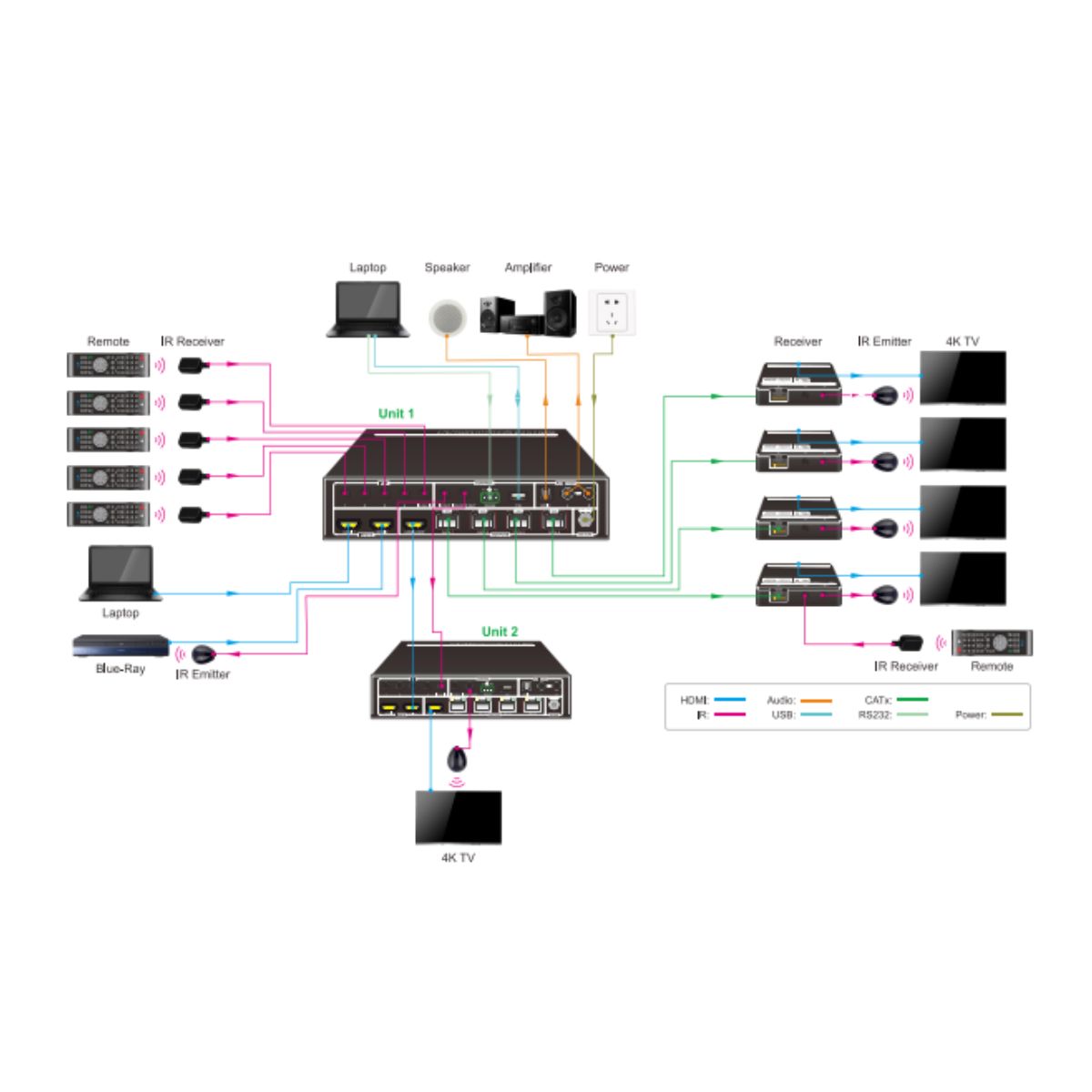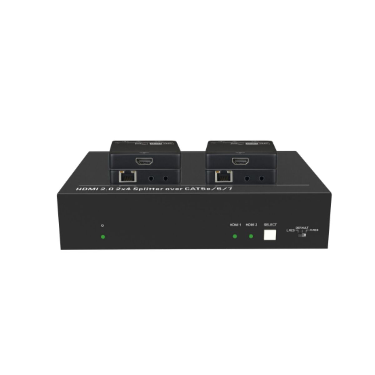Distributes one of two UHD/4K HDMI inputs to four CATx outputs and one HDMI loop output.